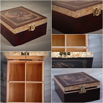 Do ozdobienia tej małej szkatułki wykorzystałam dość popularny motyw aniołów, ale uważam, iż jest on ponadczasowy i stylowy. Szkatułka wykonana jest w technice decoupage, kilkakrotnie zabezpieczona lakierem.